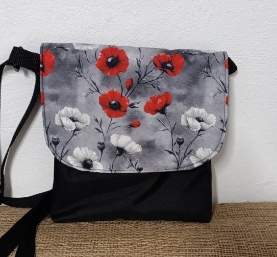 Kabelka je ušita z kočárkoviny,voděodolné látky Zapínání na zip,klopa na magnetické zapínání, uvnitř bavlněná podšívka23x24 cm, dno 4 cm,popruh nastavitelný