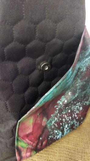 Na přední straně je kapsa na magnetické zapínání, na zadní straně je zipová kapsa.